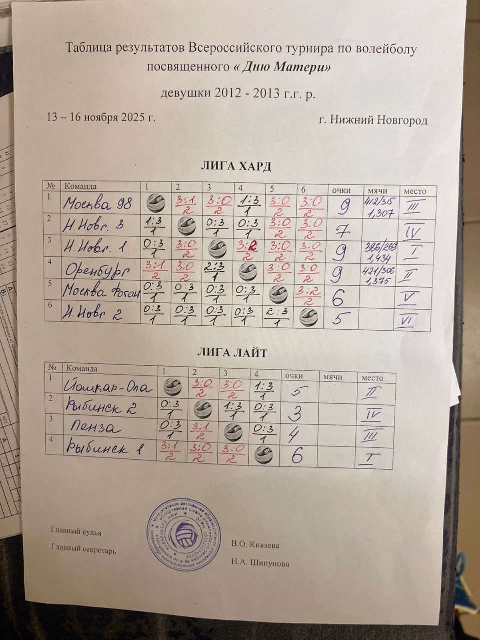 С 13 по 16 ноября 2025 г. в г. Нижний Новгород прошел Всероссийский турнир по волейболу среди команд девушек 2012-2013 г.р. посвященный «Дню Матери». Участие принимали 10 команд из г. Нижний Новгород, Москва, Оренбург, Рыбинск, Пенза, р. Марий-эл. Первое место - г. Нижний Новгород, второе место - г. Оренбург (МБУДО СШ № 3, тренеры Ситник И.Д. и Сажнева Д.И.), третье место - г. Москва. Одержав 8 побед в 9 встречах наши девочки лишь по разнице мячей уступили первое место команде г. Нижний Новгород.